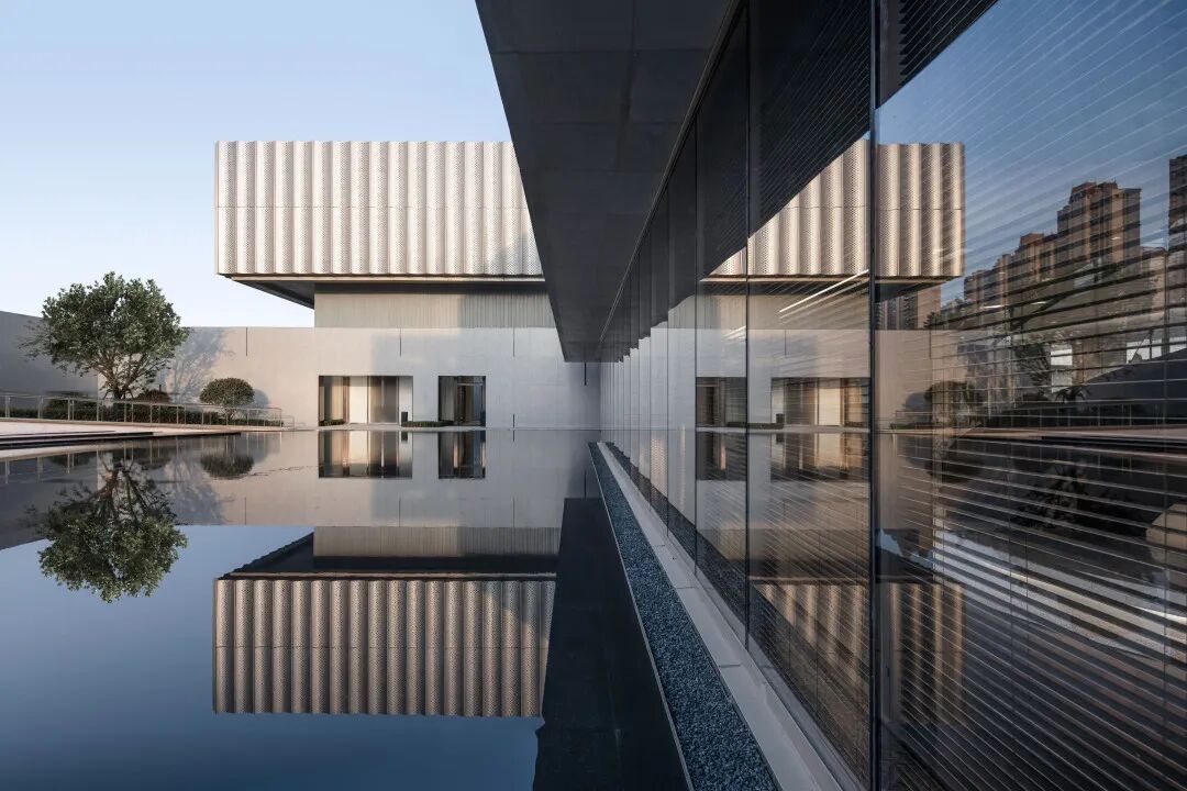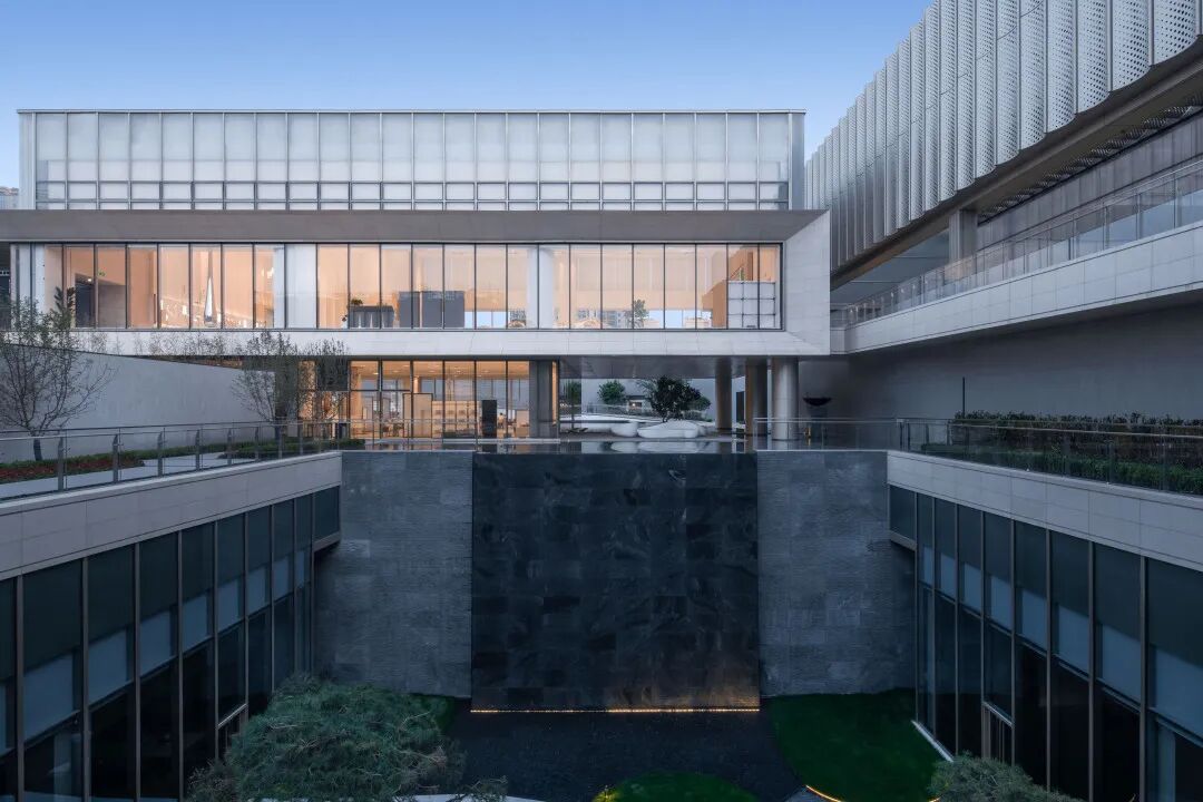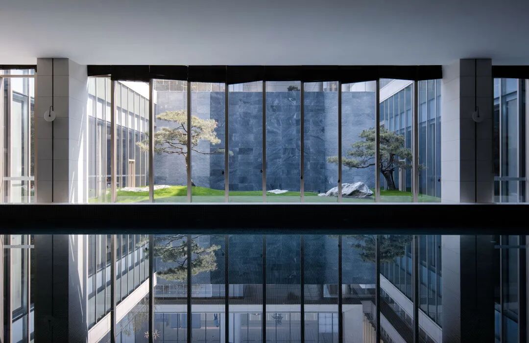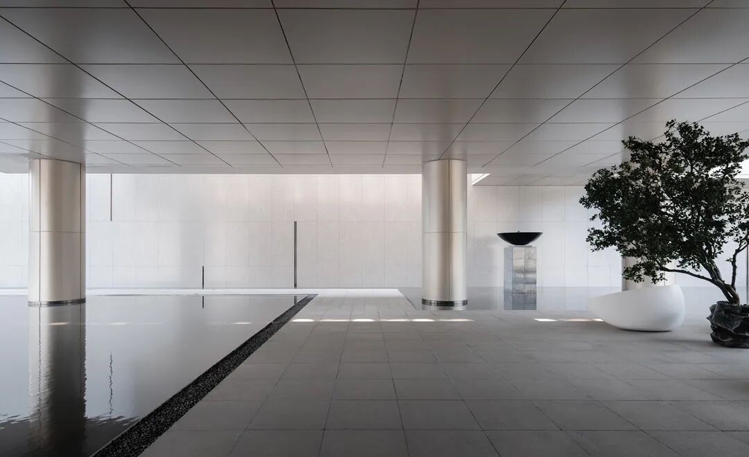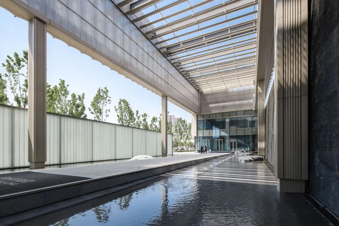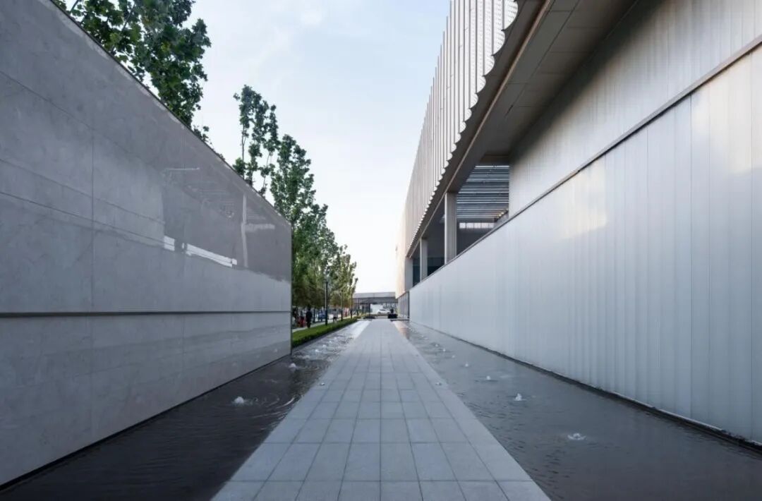 In the relatively enclosed space, the building naturally occupies the prime position. The nearby buildings and the surrounding 7M-high walls will bring a sense of visual pressure. The water beneath connects the overhead and transparent spaces. The water at the far end falls to the sunken courtyard, while the water at the near end presents a complete painting space.