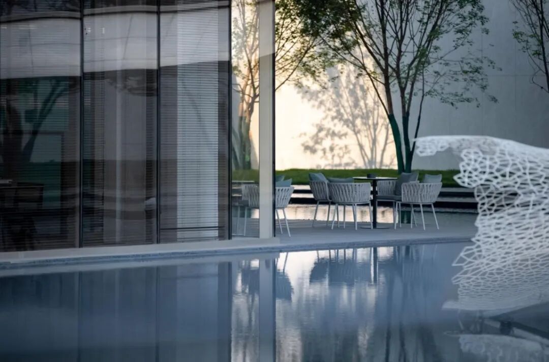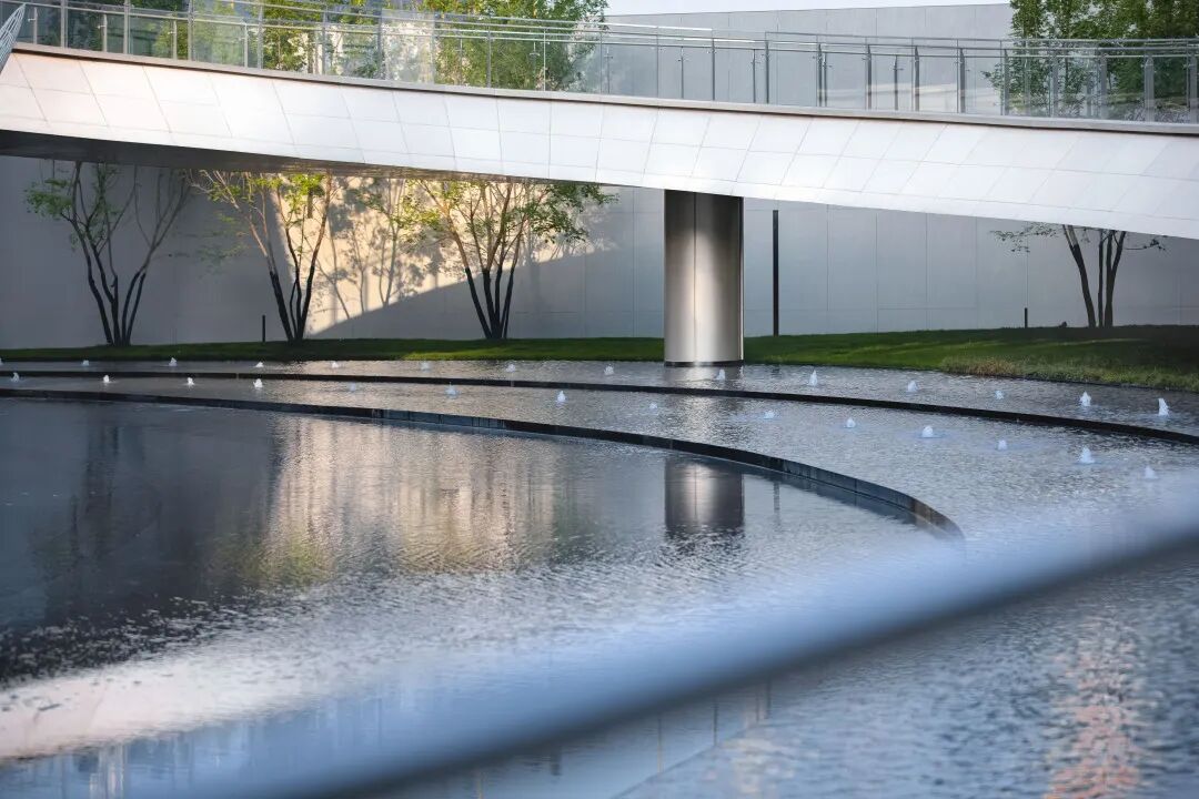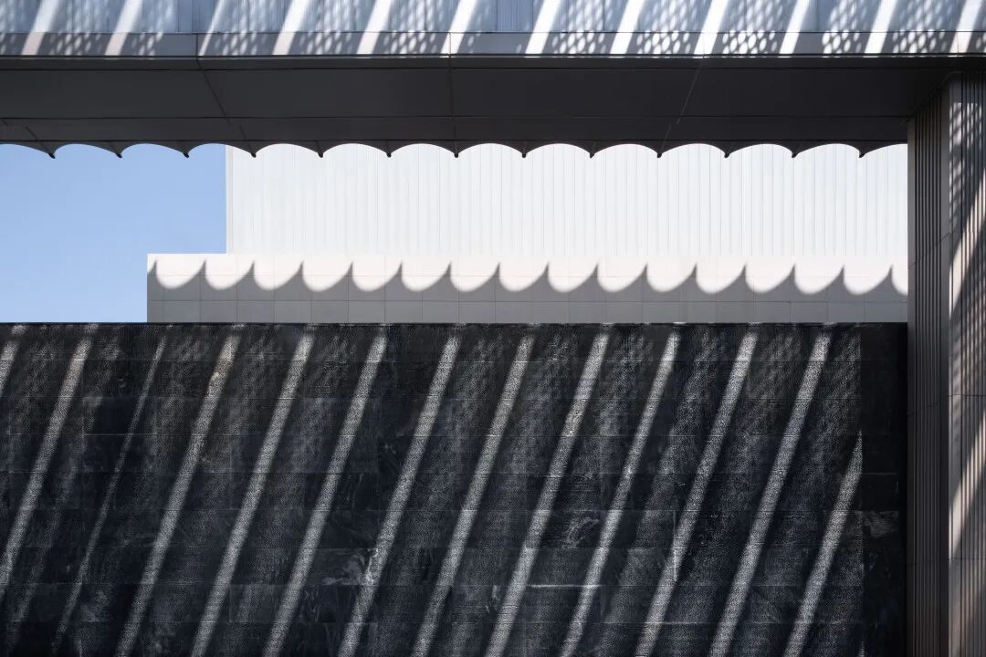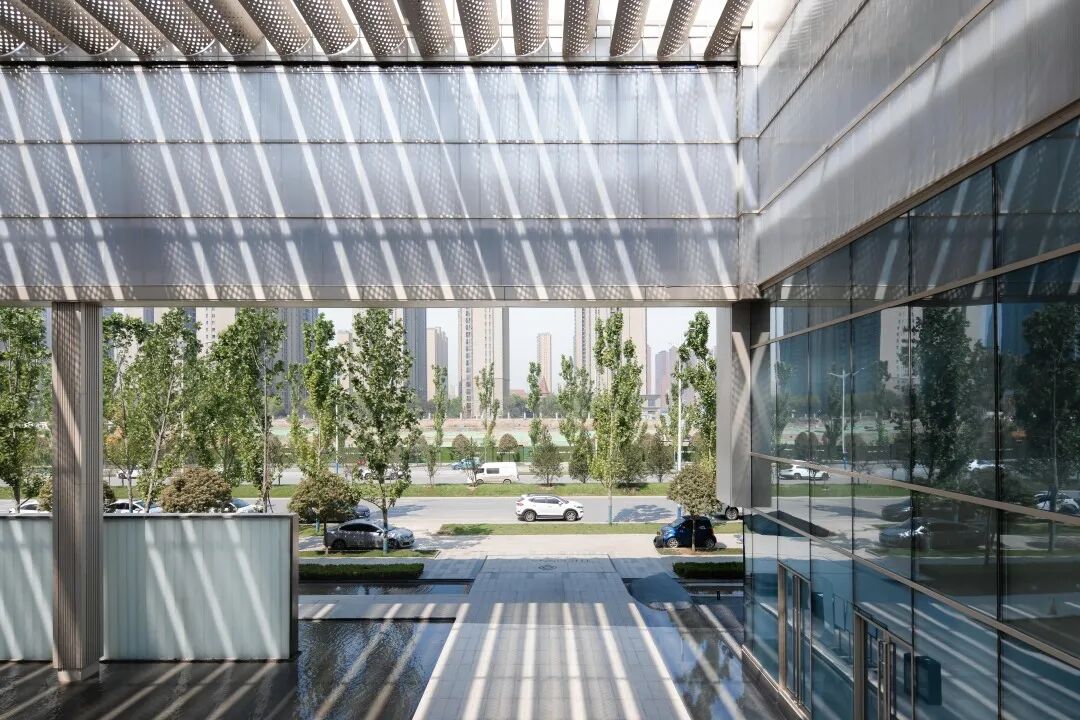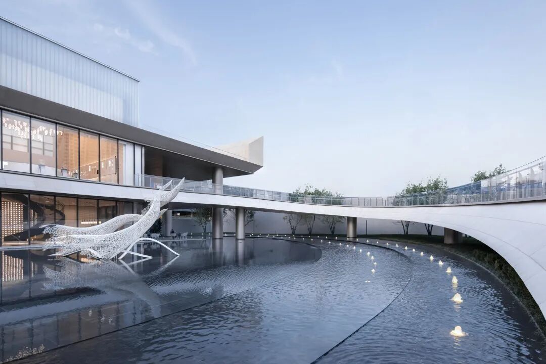 In the relatively enclosed space, the building naturally occupies the prime position. The nearby buildings and the surrounding 7M-high walls will bring a sense of visual pressure. The water beneath connects the overhead and transparent spaces. The water at the far end falls to the sunken courtyard, while the water at the near end presents a complete painting space.