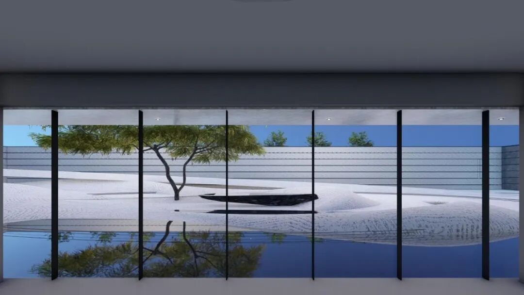The sunken space is connected by a rhythm of waterscape and texture. The interior, top and bottom of the space have a more wonderful depth of field under light and shadow, and sound and sky light are absorbed and transformed to create a soothing environment. Occasionally, the people in the court will encounter others talking in the room. Water splashes on the sand, making a clear and pleasant sound.